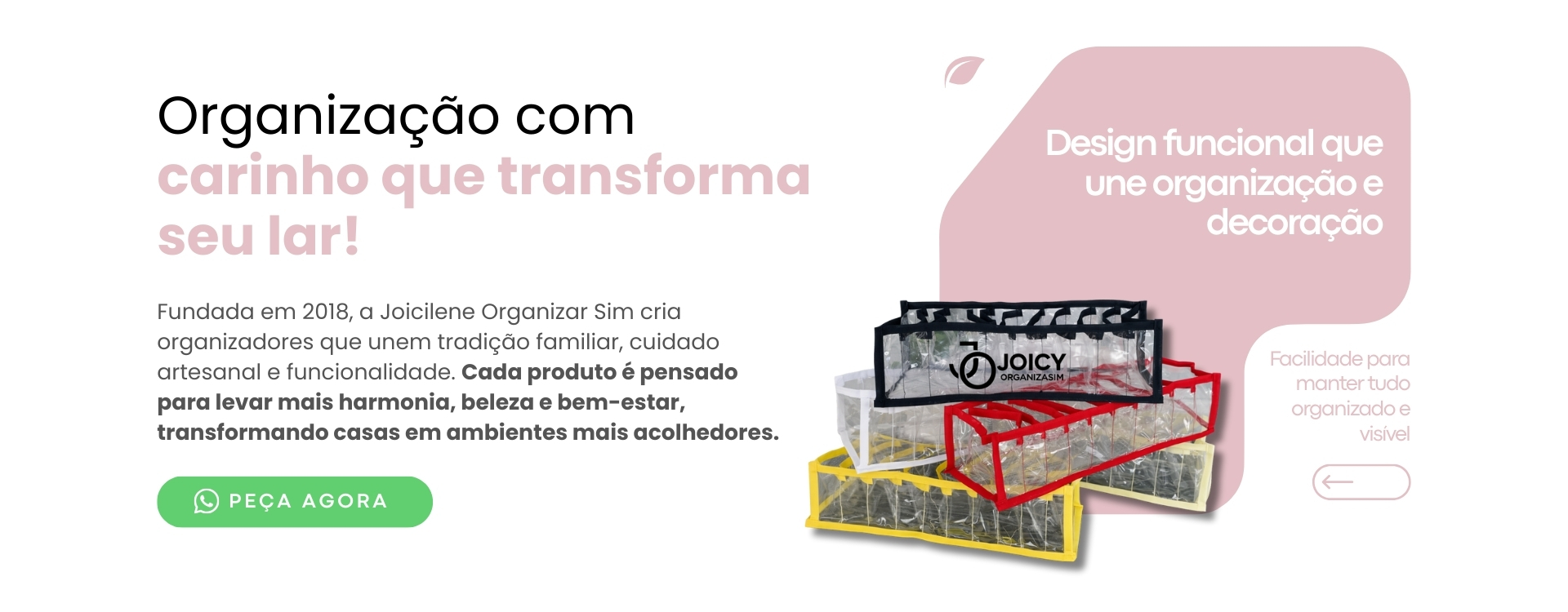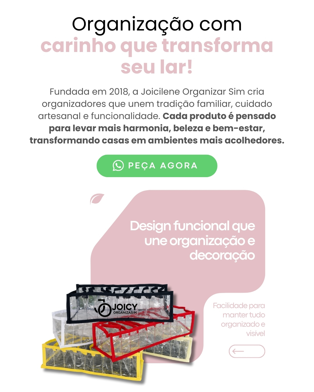 A Joicilene Organizar Sim é uma empresa fundada em 2018, inspirada na tradição familiar de trabalhar com produtos que unem organização e decoração para o lar. Desde o início, a marca se destaca por sua linha de organizadores produzidos com muito cuidado, carinho e atenção aos detalhes, oferecendo não apenas produtos, mas uma experiência única capaz de transformar ambientes.